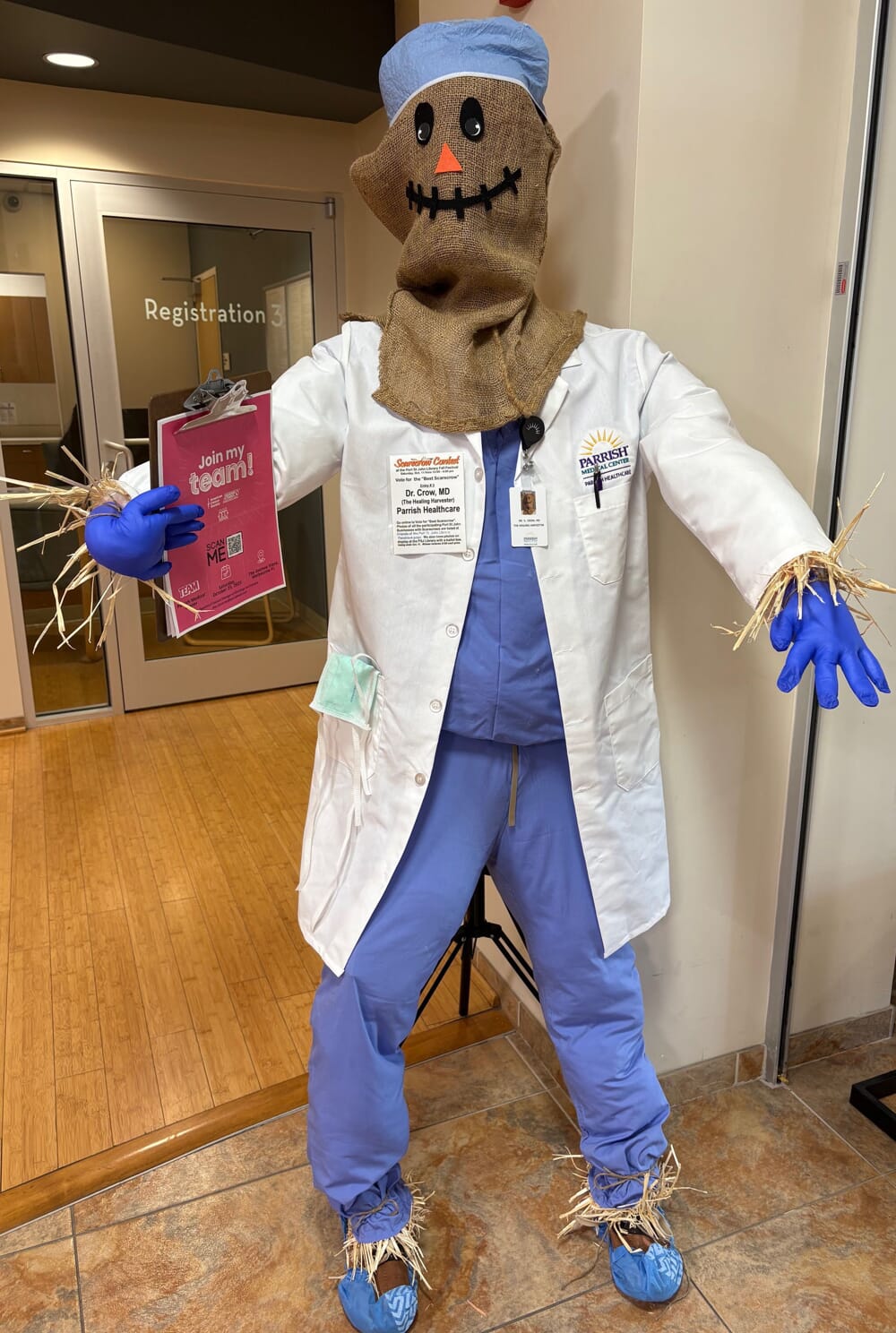 The contest invites local organizations and businesses to design and display a unique scarecrow that showcases imagination and teamwork. Parrish Healthcare’s submission, a doctor-themed scarecrow named Dr. S. Crow—The Healing Harvester, was designed wearing scrubs, a physician lab coat, disposable hygienic shoe covers and stethoscope.